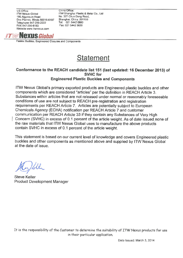 Leigo International is ITW Shanghai’s sole distributor in China, Hong Kong, VietNam and Asia Area. We have several years of experience selling plastic accessories. Please give us the opportunity to serve you in every respect whenever you need ITW products. We can respond to your needs right away from either of our warehouses. At ITW Shanghai/Nexus, they have been designing and manufacturing plastic buckles and components since the 1970’s. In fact, ITW Nexus invented the original Side Release plastic buckle witch revolutionized the plastic Side Release buckle industry. ITW continued to develop other plastic hardware and has constantly made improvementsin function, strength, and style to its designs by listening and responding to customer’s needs. Please review ITW Shanghai/Nexus products on our website. If you have any questions, or need samples, please contact us at sales@itw-sh-buckle.com We thank you for the opportunity to serve you.